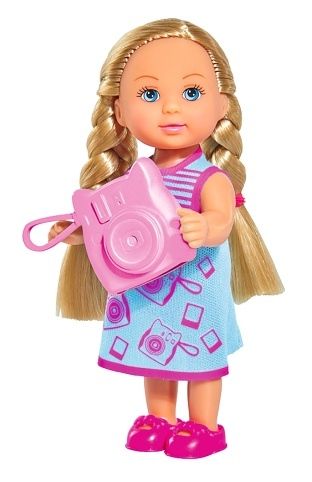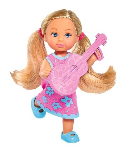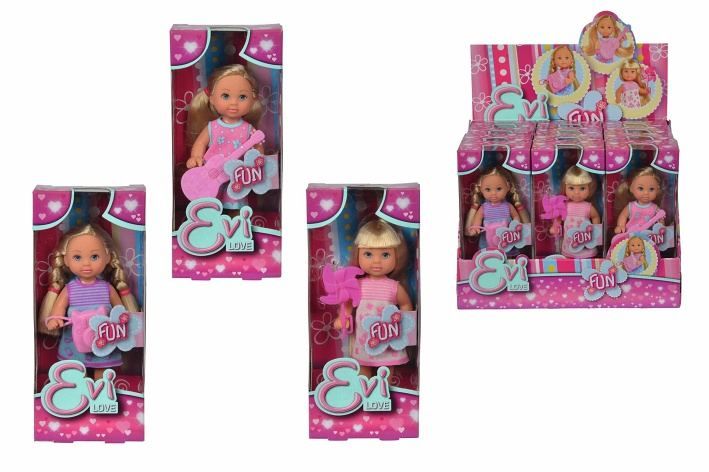 Panenka Evička ve třech různých šatičkách, 3 druhy - s kytarou, fotoaparátem nebo větrníkem. Velikost panenky 12 cm. Display 12 ks.
