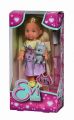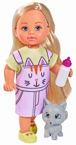 Panenka Evička v roztomilých kočičích šatech s kočičkou a lahví na pití. Velikost panenky 12 cm.