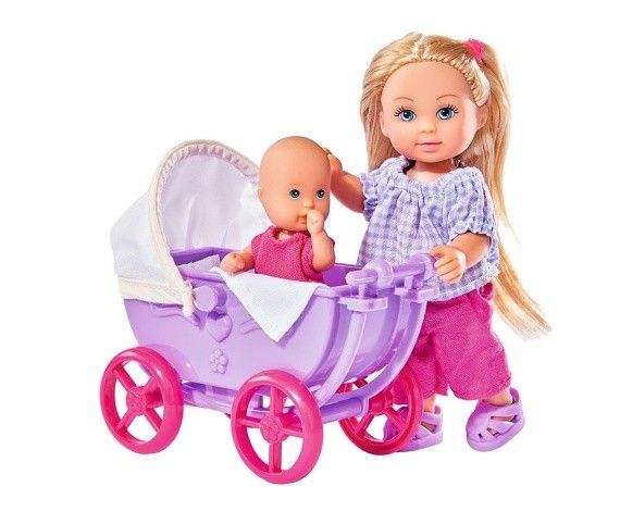 Panenka Evička na procházce s miminkem. Kočárek a další doplňky součástí. Výška panenek Evička 12 cm, mim
