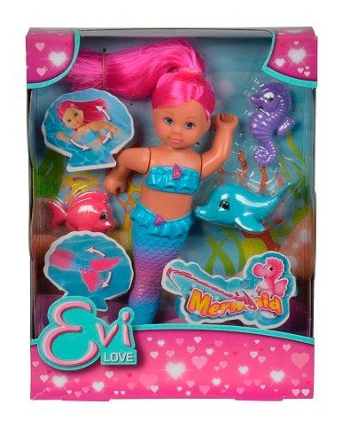 Panenka Evička jako mořská víla, která plave. Součástí i její 3 kamarádi: rybka, mořský koník a delfín. Výška panenky 12 cm.