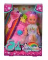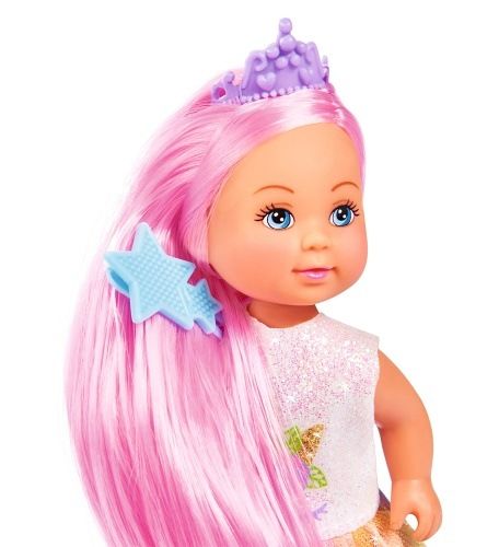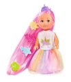 Panenka Evička jako duhová princezna s dlouhými vlasy, 4 sponkami do vlasů a hřebenem. Velikost panenky 12 cm.