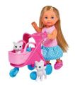Panenka Evička se 2 roztomilými kočičkami a kočárkem s odnímatelným košíkem a doplňky. Velikost panenky 12 cm.