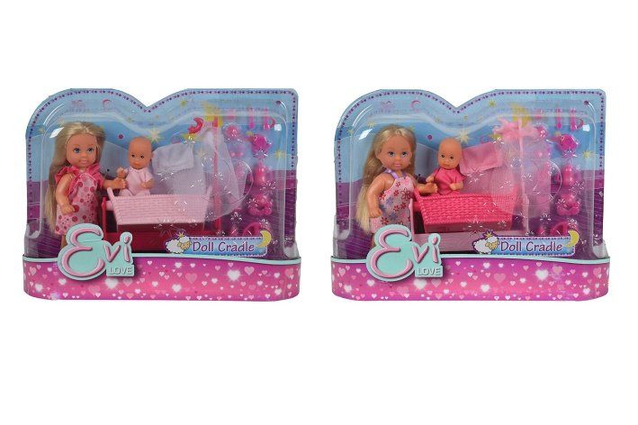 Panenka Evička s miminkem v kolébce a příslušenství, 2 druhy. Velikost panenky 12 cm a velikost miminka 5 cm.
