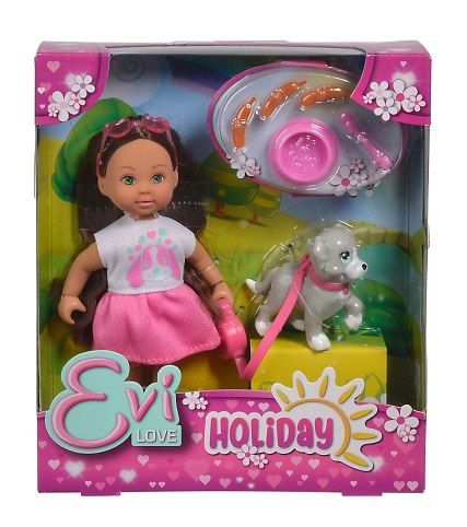 Panenka Evička s pejskem na vodítku a s příslušenstvím, klobásky, které je možno spojit dohromady a miska. Velikost panenky 12 cm.
