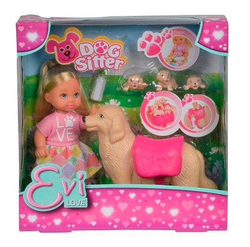 Panenka Evička se svým pejskem a 3 štěňátky. Příslušenství součástí. Velikost panenky 12 cm.