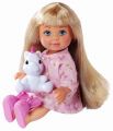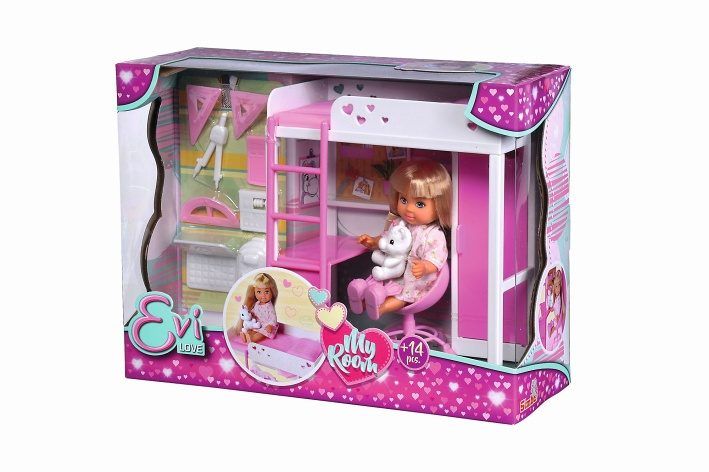 Panenka Evička s vysokou postelí, pracovním stolem, šatní skříní a dalším příslušenstvím. Výška panenky 12 cm.