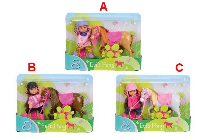 Panenka Evička přijíždí na svém poníkovi. Oblečená je stylově v jezdeckém oblečku. K dispozici má sedlo, ohlávku a jezdecký bičík. Panenka je 12 cm vysoká a je vhodná pro děti od 3 let. Hračka se vyrábí v několika variantách. Varianta je dodávána dle aktuálních skladových zásob. Cena je za 1 ks.