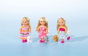 Panenka Evička má svého zvířecího mazlíčka. 3 druhy zvířátek: králíček, pejsek nebo kočička. Výška panenky 12 cm.