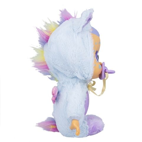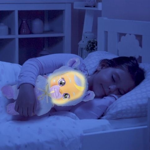 „Jenna na Dobrou noc pláče LED světelné slzy Břicho panenky je projektor k promítání hvězdné oblohy. Vydává autentické zvuky plačícího dítěte Po vložení dudlíku se uklidní a přestane brečet Hračka z měkkého plyše Jedinými plastovými prvky jsou ruce a hlava. Vhodné pro děti od 18 měsícu. Provoz na 3× AAA baterie.“ Na baterie: 3x AAA (jsou součástí balení)