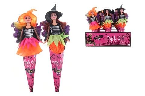 Krásná panenka v kornoutu v halloweenském oblečení. Panenka je kloubová, má pohyblivé ruce, nohy a hlavu. Materiál plast, kornout papírový. Rozměry panenky s křídly cca 35x10 cm. Věk 3+