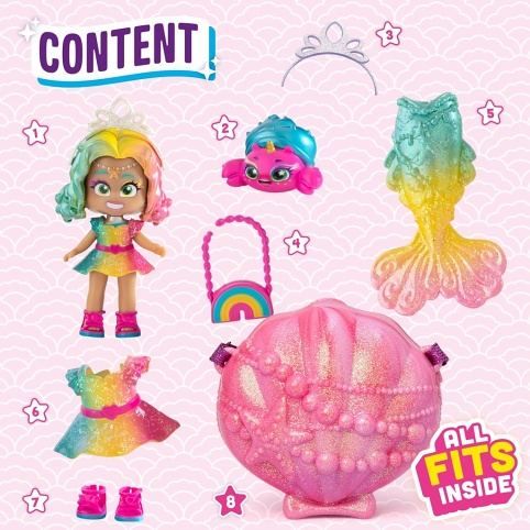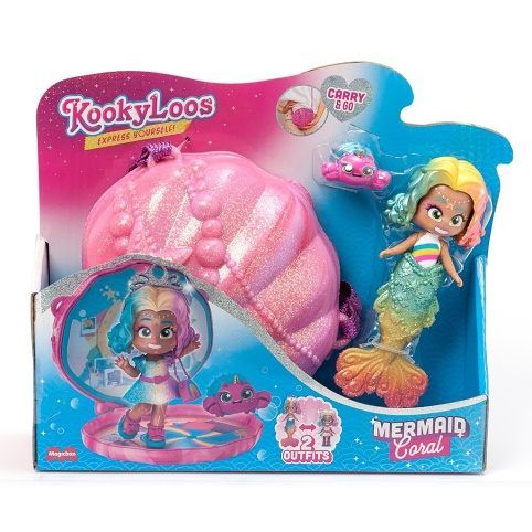 KookyLoos dobývají i moře!Objevte Star, Pearl, Coral a Jewel - malé mořské víly z Kooky Springs. Všechny jsou ve vlastní mušli, které mohou sloužit i jako taštička a můžete si ji vzít kamkoliv budete chtít! Uvnitř najdete spoustu doplňků a exkluzivního mazlíčka. Všechny navíc mají ocas mořské panny, který si můžete sundat, abyste odhalili nožičky a oblékli je do ultra-módního outfitu! Umělecká a kreativní, Coral miluje malování živočichů a mořských krajin. Milovnice korálů a jejich různorodých tvarů a barev, její motto zní: „Život je umění, žijte v barvě“. Sbírá vše duhové.Balení obsahuje – 1× kabelka – mušle, exlusivní panenka, ocas mořské víly, exlusivního mažlíčka, extra outfit, boty a ostatní příslušenství.