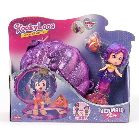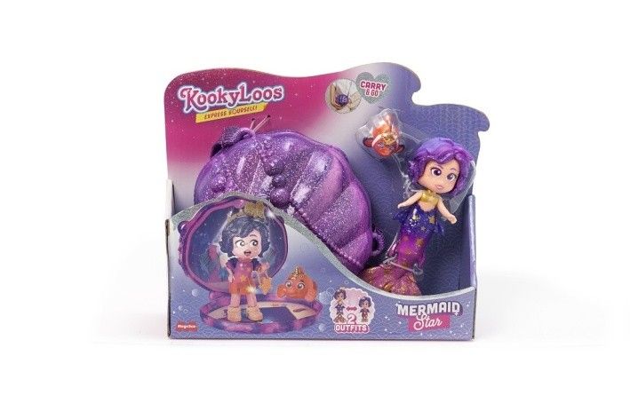 KookyLoos dobývají i moře!Objevte Star, Pearl, Coral a Jewel - malé mořské víly z Kooky Springs. Všechny jsou ve vlastní mušli, které mohou sloužit i jako taštička a můžete si ji vzít kamkoliv budete chtít! Uvnitř najdete spoustu doplňků a exkluzivního mazlíčka. Všechny navíc mají ocas mořské panny, který si můžete sundat, abyste odhalili nožičky a oblékli je do ultra-módního outfitu! Tajemná a fascinující Star miluje pozorování oblohy a zkoumání nejtajnějších oblastí oceánu. Ráda plave za měsíčního svitu. Zajímá se o astronomii a sbírá věci ve tvaru hvězd.Balení obsahuje – 1× kabelka – mušle, exlusivní panenka, ocas mořské víly, exlusivního mažlíčka, extra outfit, boty a ostatní příslušenství.