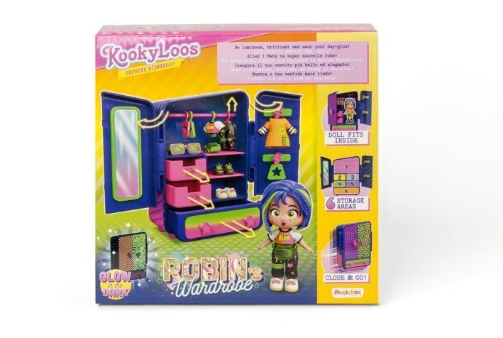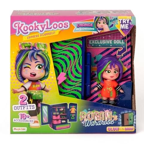 Ideální volba pro všechny dívky, které milují panenky a módu! Jaké atrakce byly připraveny tentokrát? V sérii je až 12 mini panenek ke sbírání. Každá z nich má svůj vlastní jedinečný superstyl a může změnit výraz obličeje. Stačí jedno kliknutí a stane se tak! Kromě toho se tyto roztomilé KookyLoos liší od sebe osobností a zájmy. Mezi nimi je neobvyklá Robin. Čím vyniká? Je odvážná a moderní. Zajímá se o módu a neustále sleduje aktuální trendy. Má také ráda společnost. Je vždy středem pozornosti a nikdy nezůstane bez povšimnutí. Stačí se na ni podívat – okamžitě můžete vidět její bezvadný styl. Jaký outfit se k ní nejlépe hodí? Vše záleží na náladě, sami rozhodnete co si penenka KookyLoos oblékne. Když hra skončí můžete vše uložit do praktické šatny. Balení obsahuje 1× exlusivní panenku, 2× outfit, botičky a doplňky, věšáky + zásuvky a 3× samolepku.