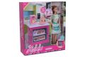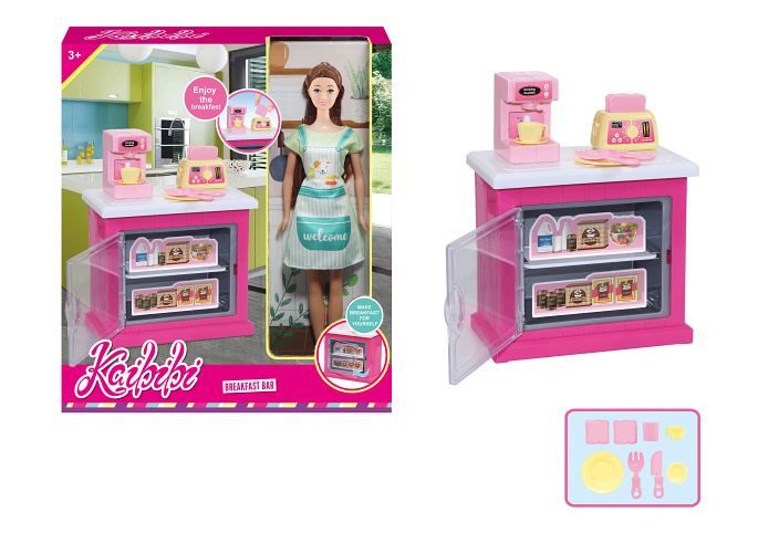 Panenka kuchařka. Velikost panenky 30 cm. Obsahuje panenku, kuchyňskou skříňku, kávovar, topinkovač a další doplňky.