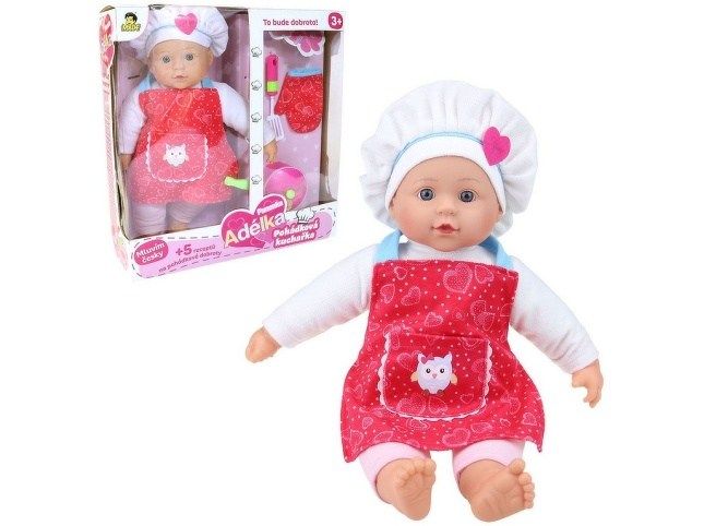 Panenka Adélka pohádková kuchařka. Mluví česky. „Pojďme uvařit něco dobrého. “ „Mám chuť na perníčky jako z perníkové chaloupky. “ „Uvaříme krupicovou kaši? Hrnečku vař!“„To bude dobrota. “ „Pozor, kaše už přetéká. Hrnečku dost!“ „Chystáš se na cestu? Napeč si buchty do uzlíčku!“ „Dala bych si šípkový čaj. Medově sladký jako od Šípkové Růženky. “„Víš, kde létají pečená kuřátka přímo do pusy? No přece u maminky!“ Napájení 3 x 1,5V AG13. Český box o rozměrech 37 x 36 x 11 cm. Výška panenky 36 cm. Bohaté příslušenství. Součástí balení je i malá pohádková kuchařka s recepty. Recepty na pět pohádkových dobrot obsahují např. krupicovou kaši, perníčky, buchty atd.
