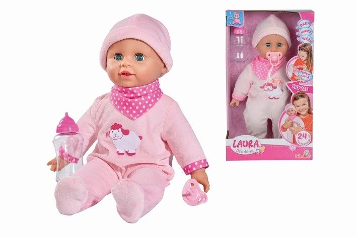Panenka Laura má měkké tělíčko, zavírací očíčka, pije z lahvičky a vydádá 24 zvuků. Lahvička a dudlík součástí. Velikost panenky 38 cm.