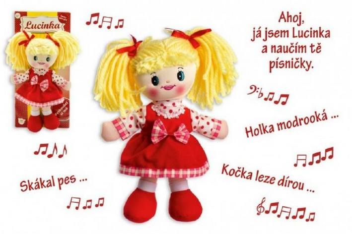 Hadrová panenka Lucinka po zmáčknutí bříška povidá: "Ahoj, já jsem Lucinka a naučím tě písničky" a zpívá písničky "Skákal pes..., Holka modrooká..., Kočka leze dírou..." Rozměr: 30 cm, na kartě 18 x 38 x 9 cm Vhodná od 0 let Výrobek obsahuje nevyměnitelné baterie