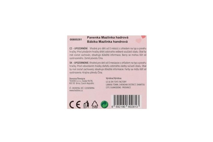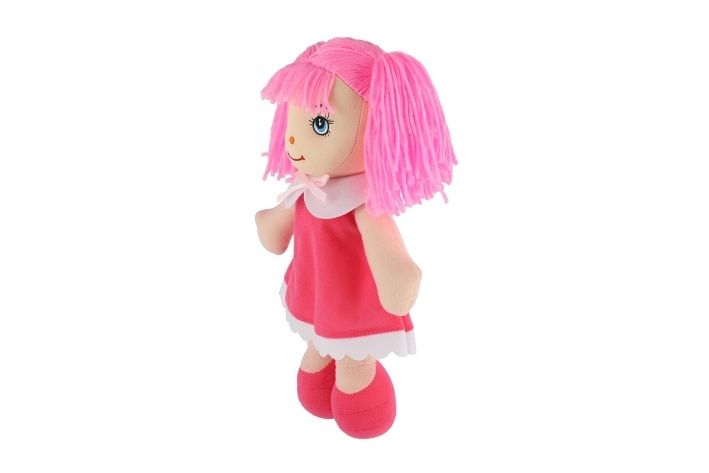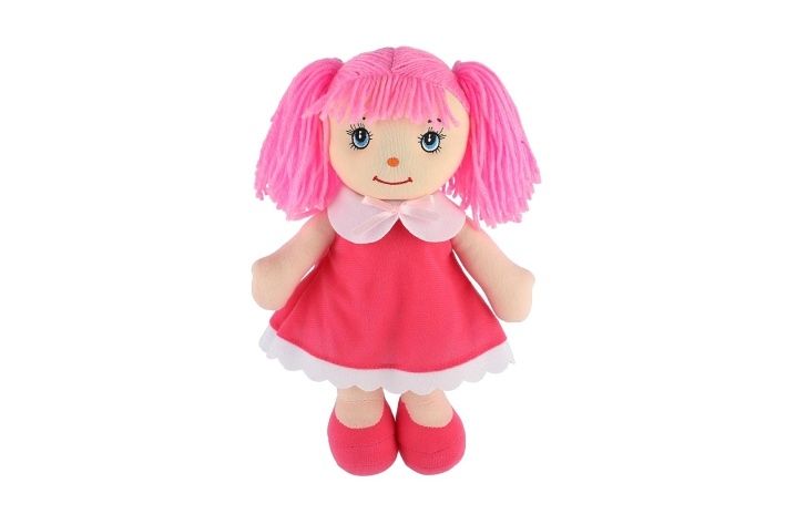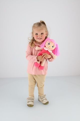 Hadrová panenka s růžovými vlásky v šatičkách má měkké tělíčko. Mazlinka bude nejlepší kamarádka nejen na mazlení, ale i ke hraní. Díky svému příjemnému materiálu a roztomilému vzhledu se stane skvělou kamarádkou pro každodenní dobrodružství i uklidňující usínání.