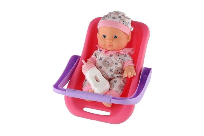 Panenka miminko plast 22cm pevné tělo v nosítku/autosedačce s lahvičkou 2 barvy v blistru