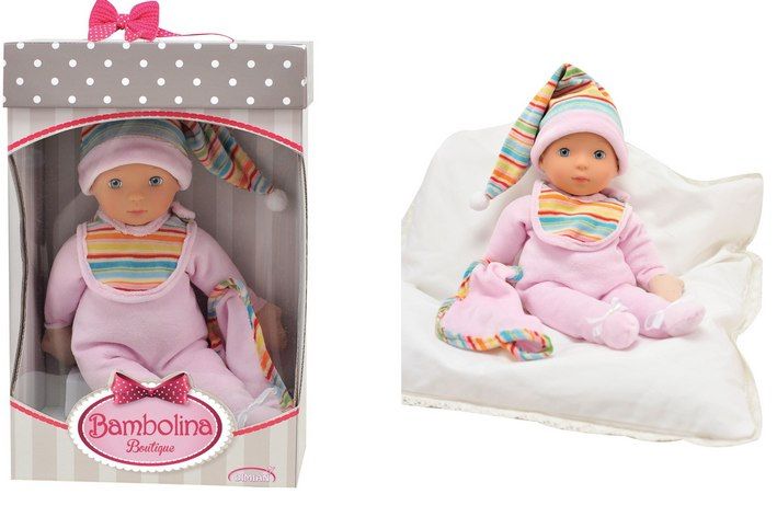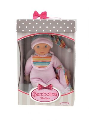 První moje miminko Bambolina Boutique je krásná panenka o velikosti 36cm cm vhodná pro ty nejmenší děti. Panenka má měkké tělíčko, obleček, čepičku a bryndáček.