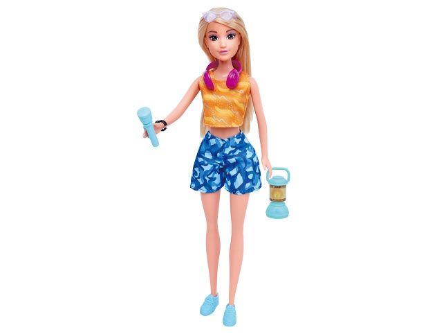 Panenka na výletě s doplňky. Velikost 30 cm. Doplňky - batoh, dalekohled, sluchátka, brýle, kšilt, láhev, svítilna, selfie tyč a další.