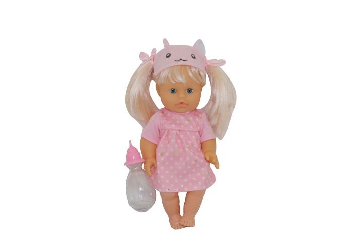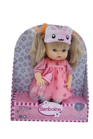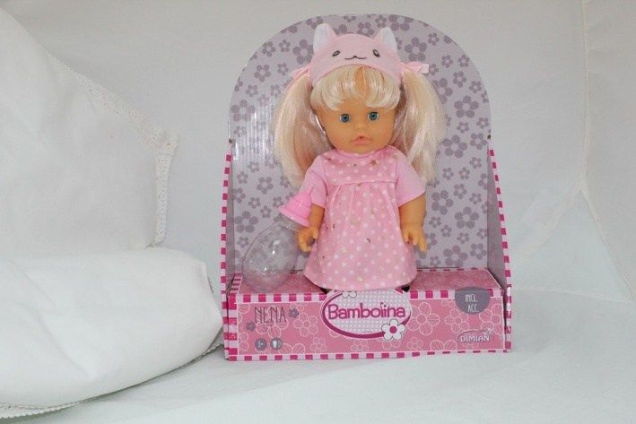 Panenka Nena o velikosti 36 cm. Součástí balení je škraboška a lahvička. Panenka má funkci: drink and wet (napij se z lahvičky a čůrej).