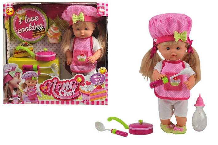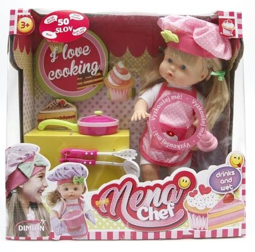Krásná holčička jako kuchařka, připravená pro tebe. Panenka Nena umí 50 slov, mluví plynule a velmi zřetelně v krátkých větách. Umí pít z lahvičky a po té má potřebu čůrat.