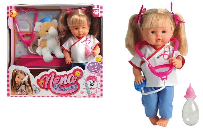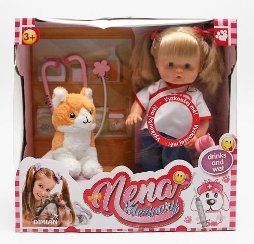 Nena je milou panenkou, která je tentokrát veterinářkou. Její kočička je vyrobena z plyše.