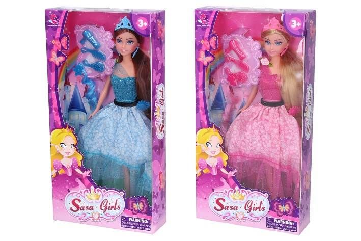 Panenka princezna s příslušenstvím. Velikost 29 cm. Příslušenství: 2 hřebeny, příčesek, fén. 2 varianty: modrá, růžová