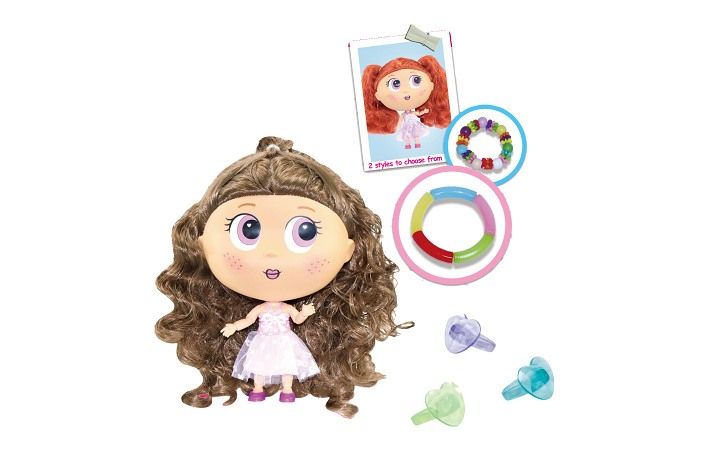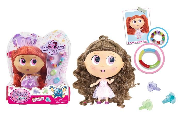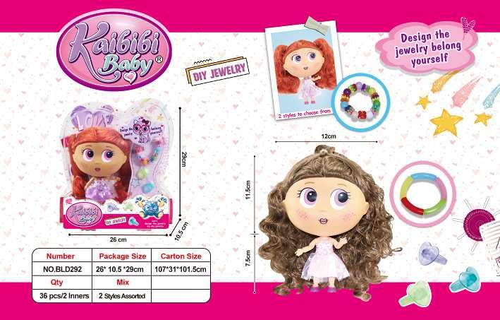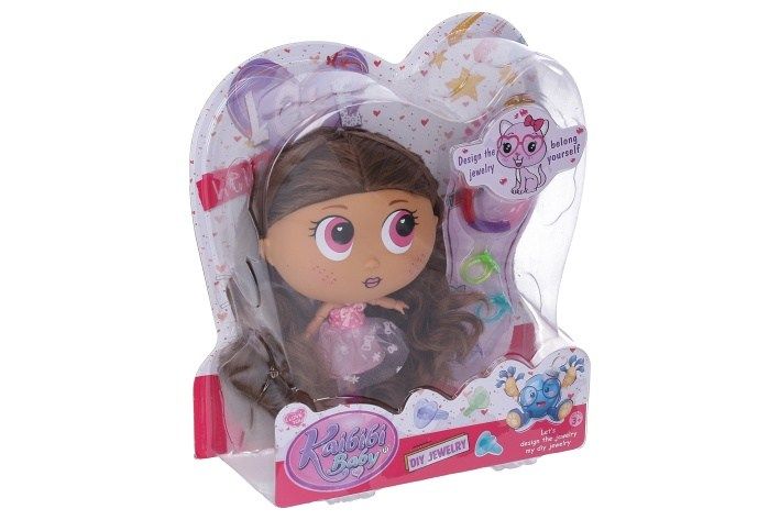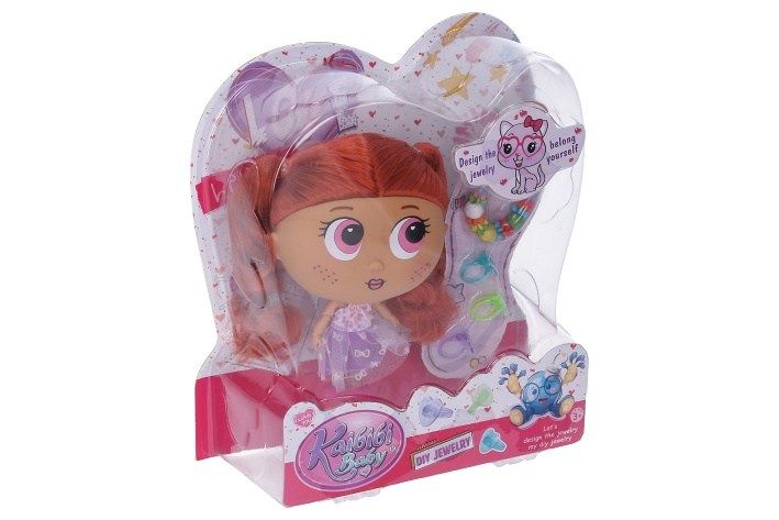 Panenka s doplňky. Velikost 18 cm. Součástí náramek, 3 prstýnky. 2 varianty - hnědé, rudé vlasy.