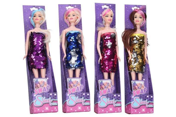 Obléct, učesat a hurá do města za zábavou! Panenka bude díky stylovému barevnému pruhu ve vlasech a cool šatech s flitry prostě k nepřehlédnutí! Flitry na šatech po přejetí rukou mění barvu.