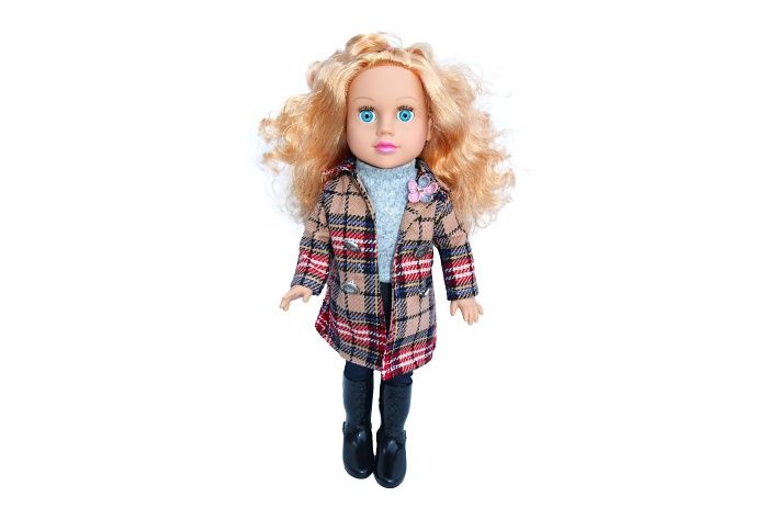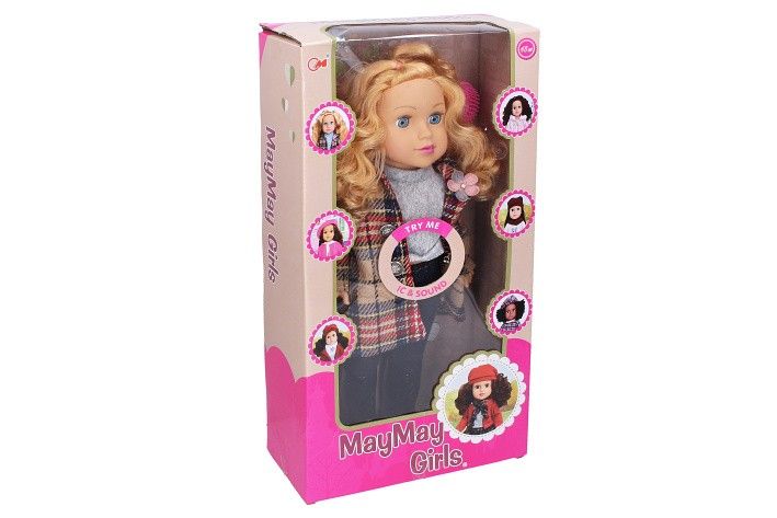 Panenka s kabátem a zvukovými efekty. Velikost 48 cm. Zvukové efekty stlačením bříška. 3xAG13 baterie a hřeben součástí.