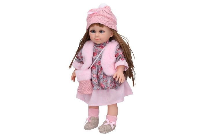 Panenka s kabelkou. Měkké tělíčko. Velikost 38 cm. 3xAG13 baterie, jsou součástí balení.