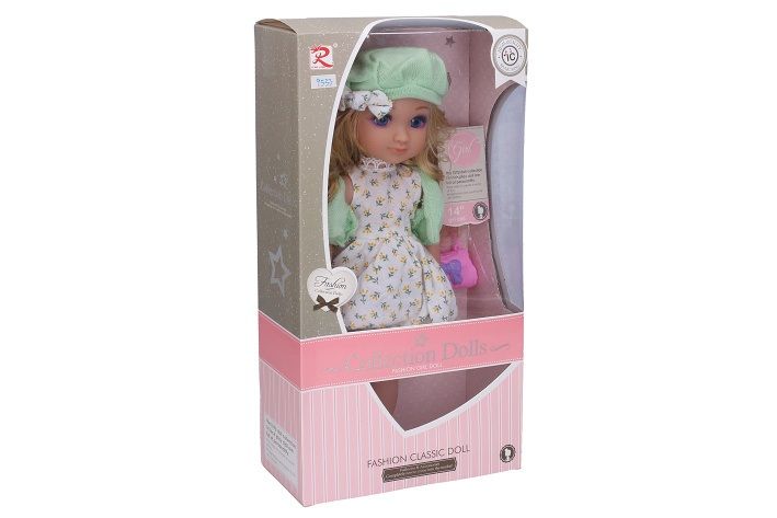 Panenka s kabelkou, čepicí a zvukovými efekty. Velikost 36 cm. Zvukové efekty stiskem bříška. 3xAG13 baterie součástí. Součástí hřeben a kabelka.