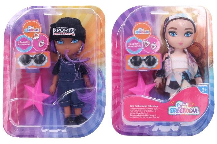 Panenka s kartáčem na vlasy a dalšími doplňky. Rozměry 6x17 cm. Součástí panenka, kartáč ve tvaru hvězdy, náušnice, brýle. 2 varianty - černé oblečení, bílé oblečení.