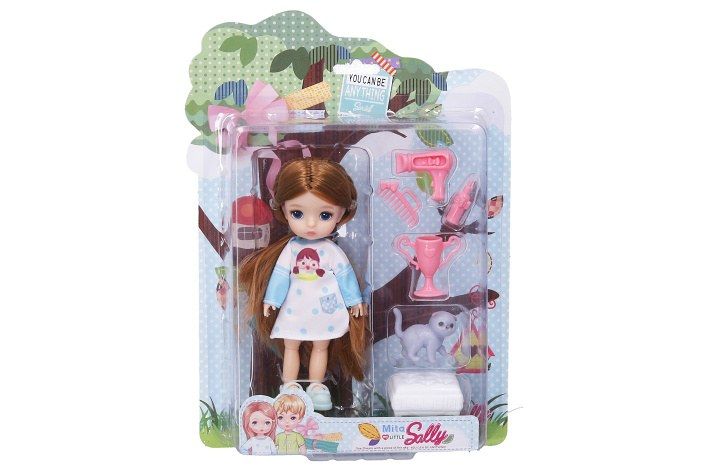 Panenka s kočkou set. Velikost 12,5 cm. Pohyblivé klouby. Obsah balení - panenka, figurka kočky, příslušenství.