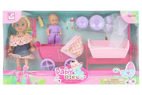 Panenka s miminkem a doplňky. Balení obsahuje panenku, miminko, kočárek, kolébku a další doplňky. Rozměry balení cca 27 x 15 x 5,5 cm. Věk 3+