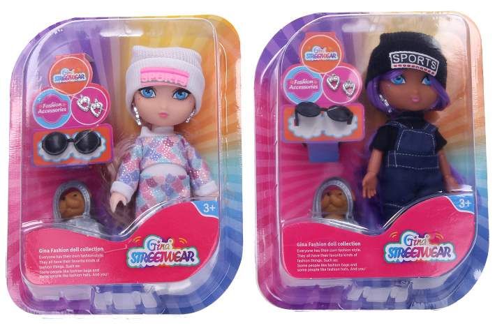 Panenka s pejskem a dalšími doplňky. Rozměry 6x17 cm. Součástí panenka, kabelka, pejsek, náušnice, brýle. 2 varianty - černé oblečení, bílé oblečení.