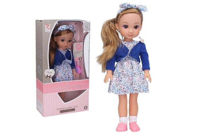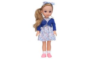 Panenka s šátkem. Velikost 35cm. Zvukové efekty. obsahuje: panenku, kabelku, hřeben. 3xAG13 baterie součástí.