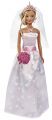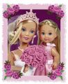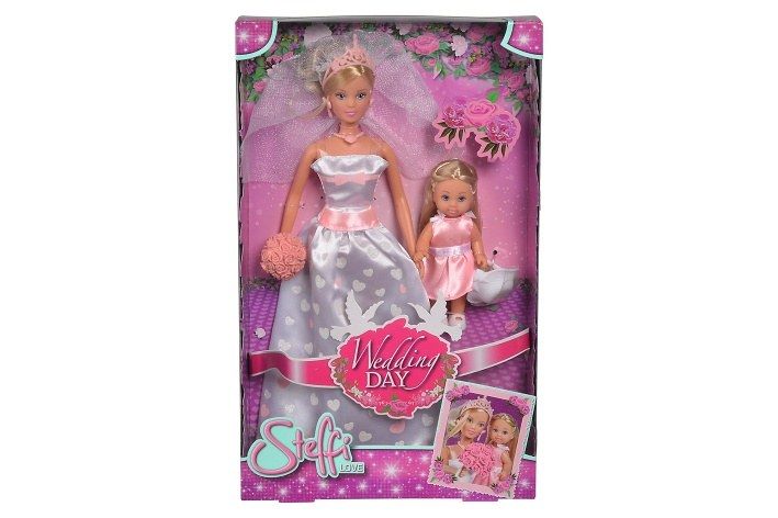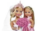 Panenka Steffi s kyticí růží v nádherných svatebních šatech, s panenkou Evičkou v růžových šatičkách družičky s košíčkem s květy. Velikost panenek 29 a 12 cm.