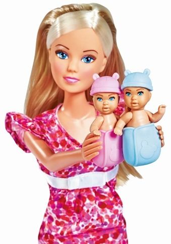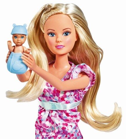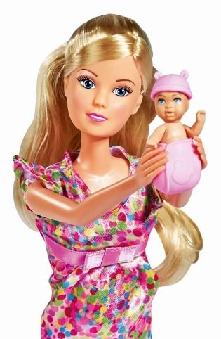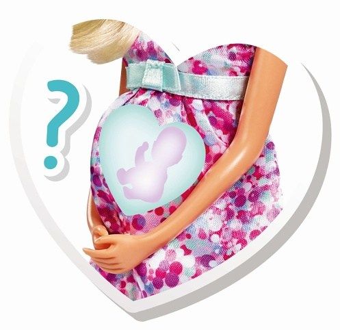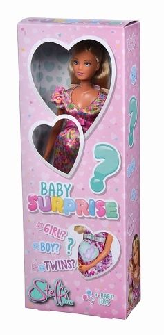 Těhotná panenka Steffi s dítětem jako překvapení a s více než 11 doplňky. Bude to chlapeček, holčička nebo dvojčátka? Velikost panenky 29 cm.