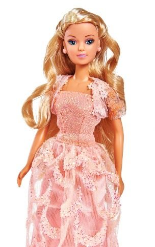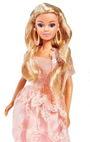 Panenka Steffi v okouzlujících třpytivých šatech včetně další doplňků - kabátku, střevíčků, náušnic a třpytivé kabelky. Velikost panenky 29 cm.