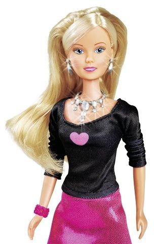 Panenka Steffi v sukni a obchod se šperkama. Součástí je 2x náhrdelník, náušnice, náramek, kabelka. Velikost panenky 29 cm.