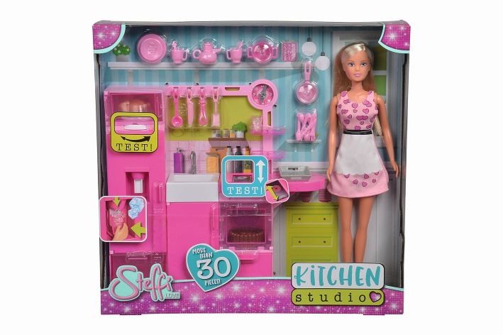 Panenka Steffi s kuchyní s bohatým příslušenstvím, lednicí, mikrovlnkou a troubou. Obsahuje více než 30 ks. Panenka součástí. Výška panenky 29 cm.
