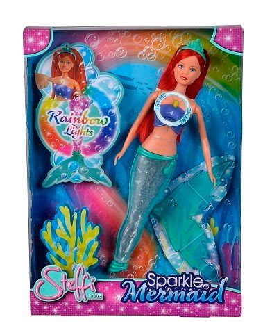 Panenka Steffi jako mořská víla s kouzelnou duhovou světelnou ploutví, voděodolná. Výška panenky 39 cm.