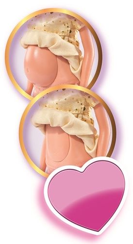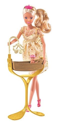 Panenka Steffi jako těhotná princezna. Miminko i panenka v královských šatech a s korunkou. Kolébka pro miminko součástí. Výška panenky 29 cm. Výška miminka 5 cm.
