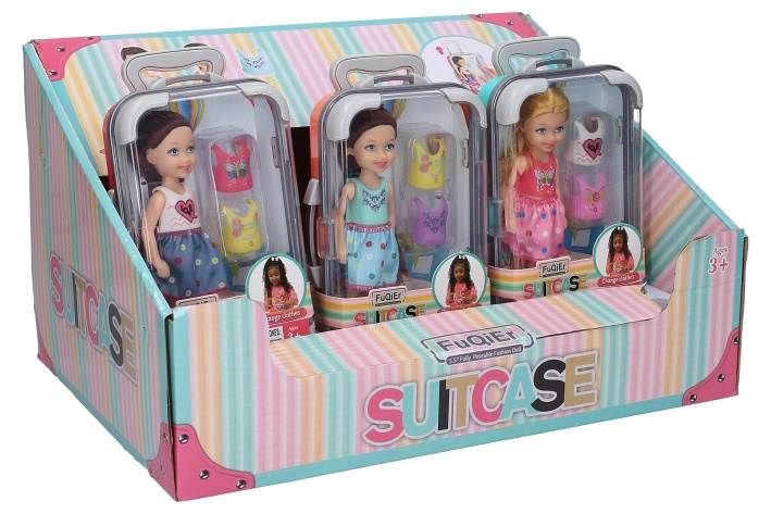 Panenka v kufru. Velikost panenky 14 cm, velikost kufru 20 cm. Obsahuje panenku a dvě náhradní trička na panenku. Display box - 12 ks. 3 varianty - červená, modrá, oranžová.