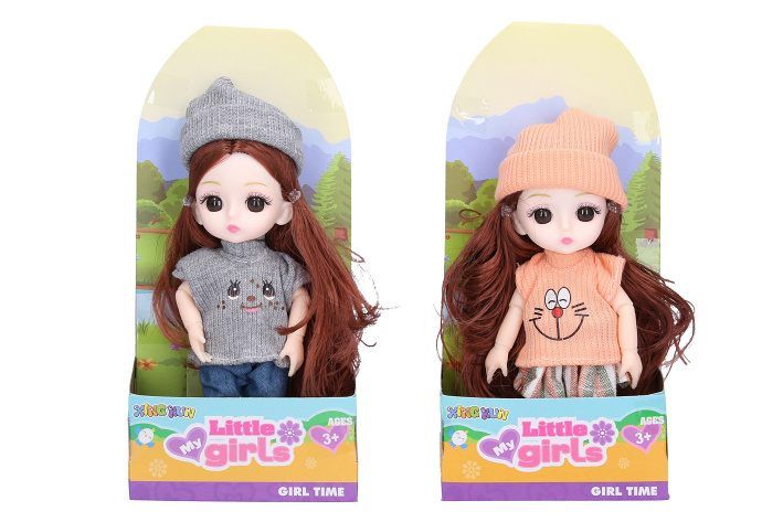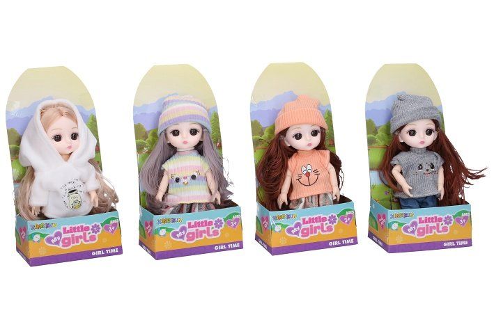 Panenka v zimním oblečení. Velikost 15 cm. Pohyblivé klouby. Display box 12 ks. 4 varianty - bílá, šedá, červená, duhová.