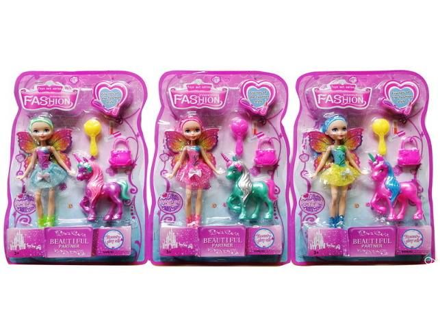 Panenka víla s jednorožcem. Velikost panenky 21 cm. Součástí víla, hřeben, kabelka, jednorožec. 3 barevné varianty jednorožce - fialová, zelená, růžová.