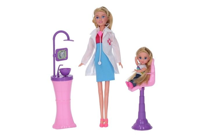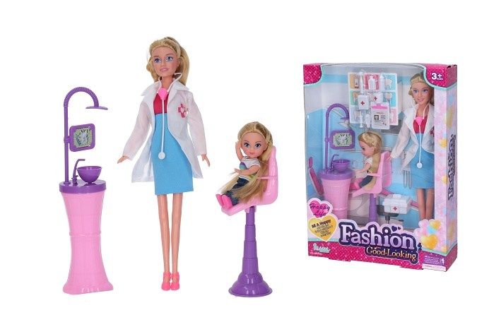 Panenka zubařka s holčičkou. Velikost 29 cm. Balení obsahuje panenku zubařku, malou panenku holčičku a příslušenství: lékařské potřeby, vybavení zubařské ordinace.